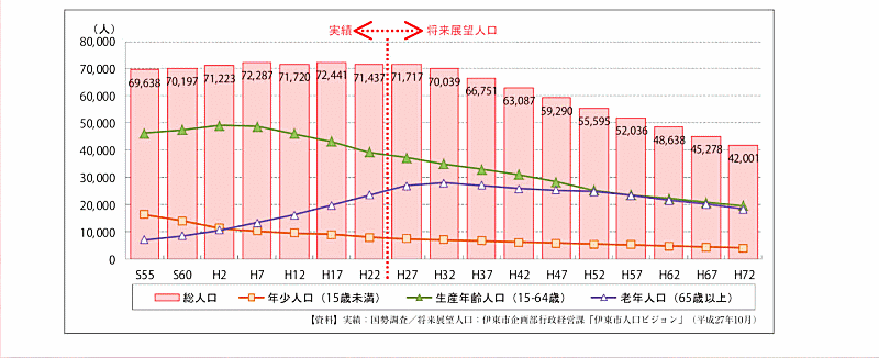 伊東市の人口は令和17年には6万人を割り5万人に減少。