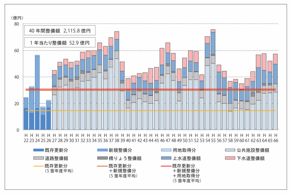 年平均38億不足しているのは、あくまでも現存の施設の改修・修繕などの「整備費=建設費」です。